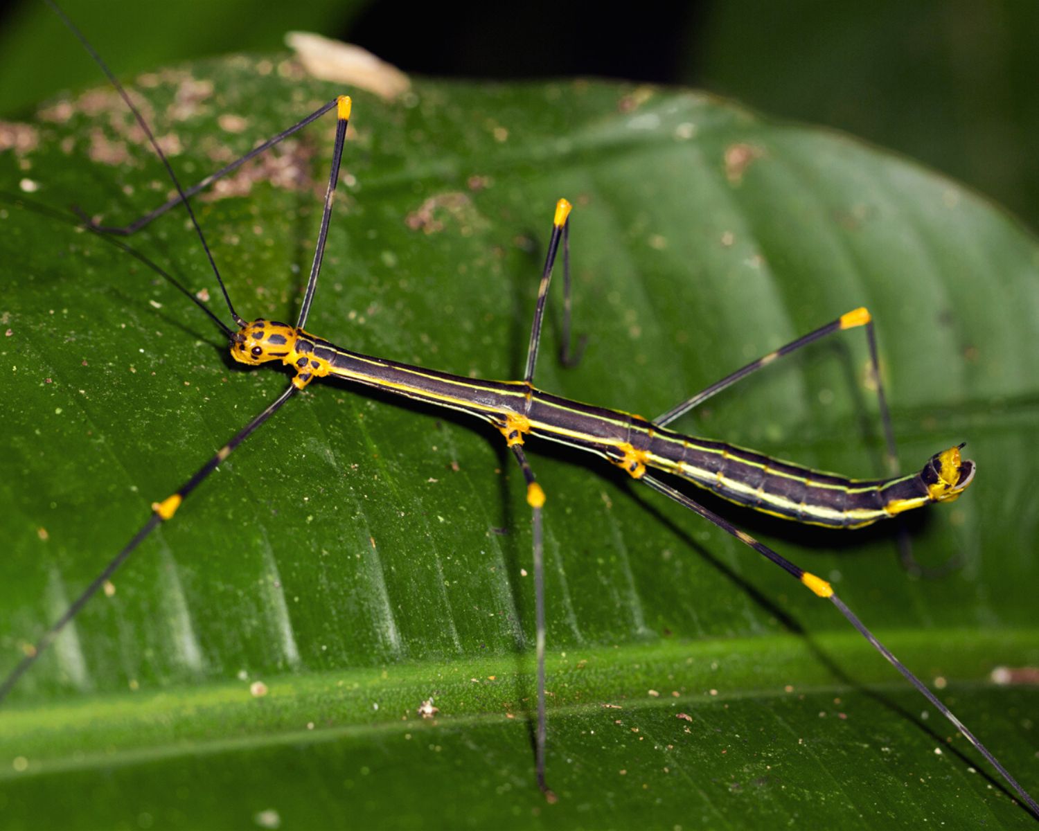 Un hermoso insecto palo peruano de colores llamativos que mide menos de 10 cm en la fase adulta.